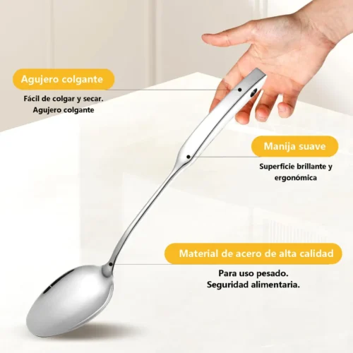 Los utensilios no se doblan, no se oxidan y soportan temperaturas elevadas. Su apariencia plateada aporta elegancia y profesionalismo a tu cocina.