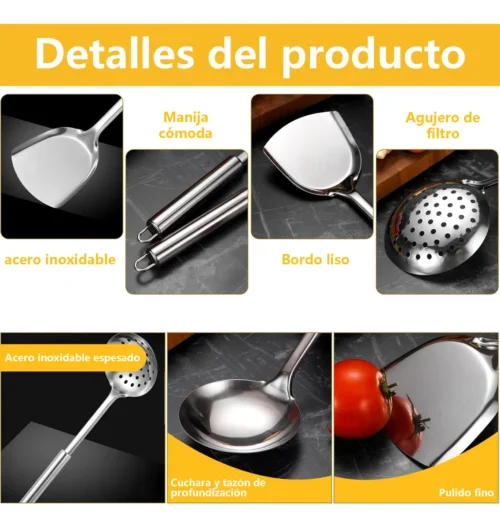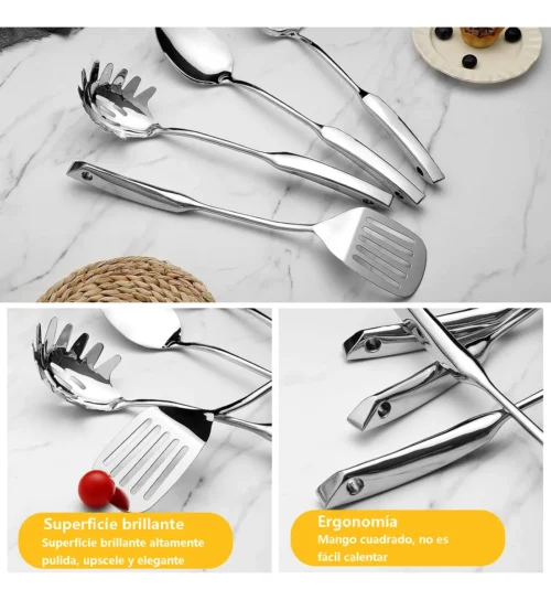 • Juego de utensilios de cocina fabricado en acero inoxidable 18/8 de grado alimenticio.