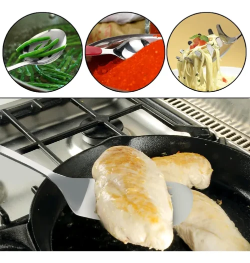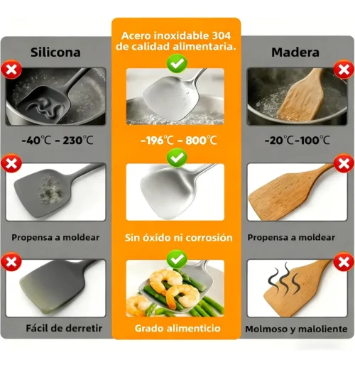 Perfecto para sartenes antiadherentes, acero, hierro, teflón y más. Ideal para saltear, freír, servir, revolver y cocinar de manera eficiente.