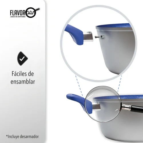 Antes del primer uso se recomienda realizar el curado del sartén, siguiendo los pasos incluidos dentro del empaque. El mango requiere ensamble por parte del cliente e incluye todo lo necesario para su instalación.